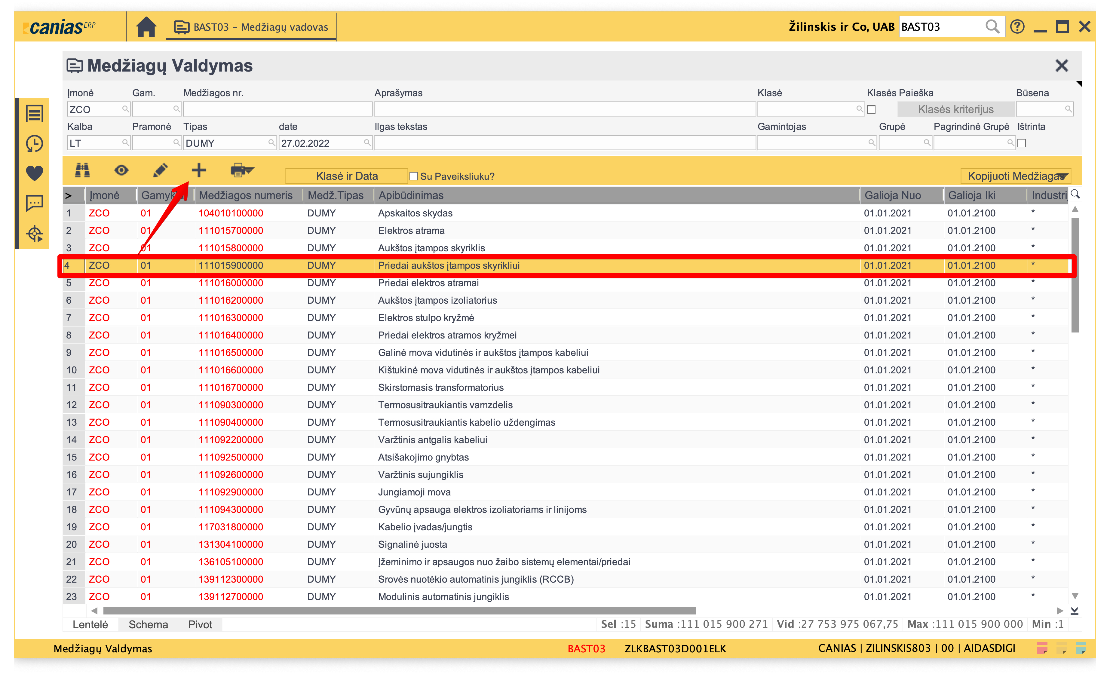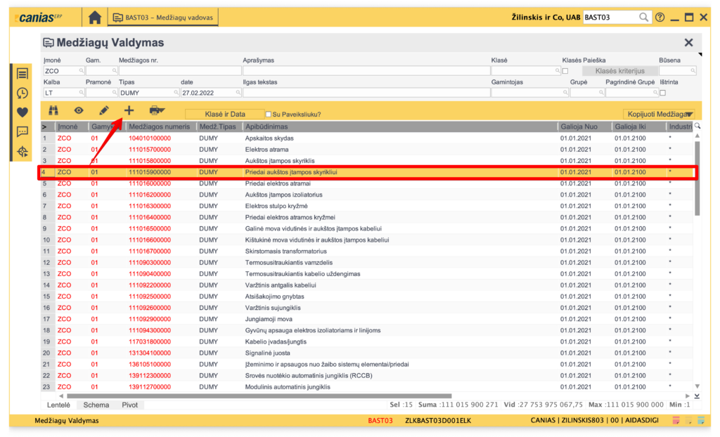 - Siekiant įvesti medžiagos kortelę, galima ją kopijuoti nuo kitos. Susirandame panašaus pobūdžio kortelę, pažymime visą eilutę ir spaudžiame + simbolį.