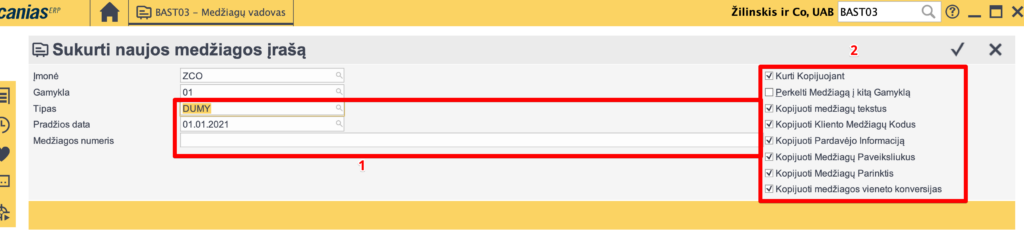 2. Atsivėrusiame naujame lange, pasirenkame reikiamus parametrus, kurie atitiks naujai kuriamai medžiagos kortelei: