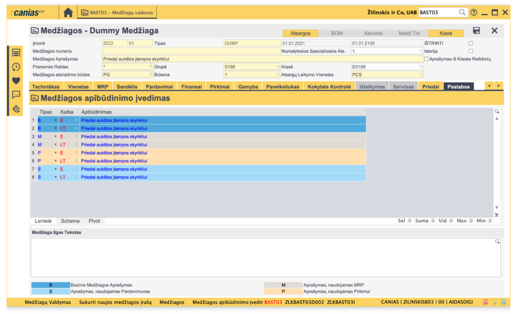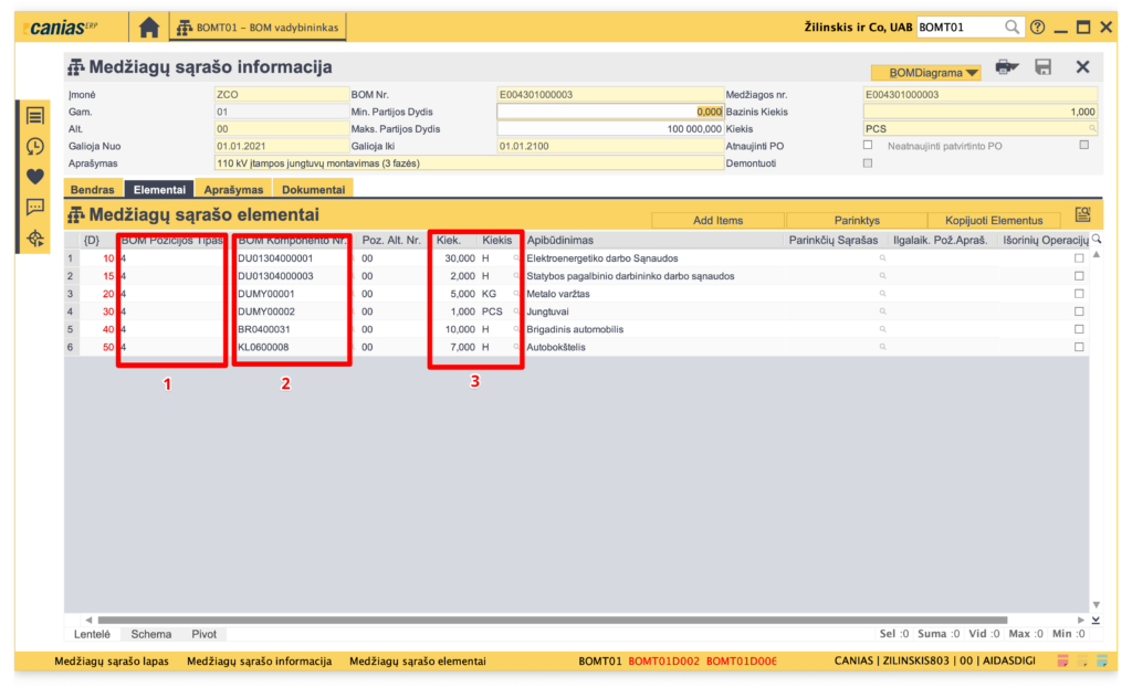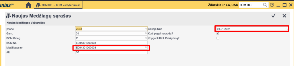 Sukūrus visas medžiagų korteles, kurios turi patekti į įkainį, pereiname prie BOMT01 modulio ir kuriame įkainio sudedamąsias dalis. Šiame modulyje taipogi galime kopijuoti vieno nuo kito įrašus.