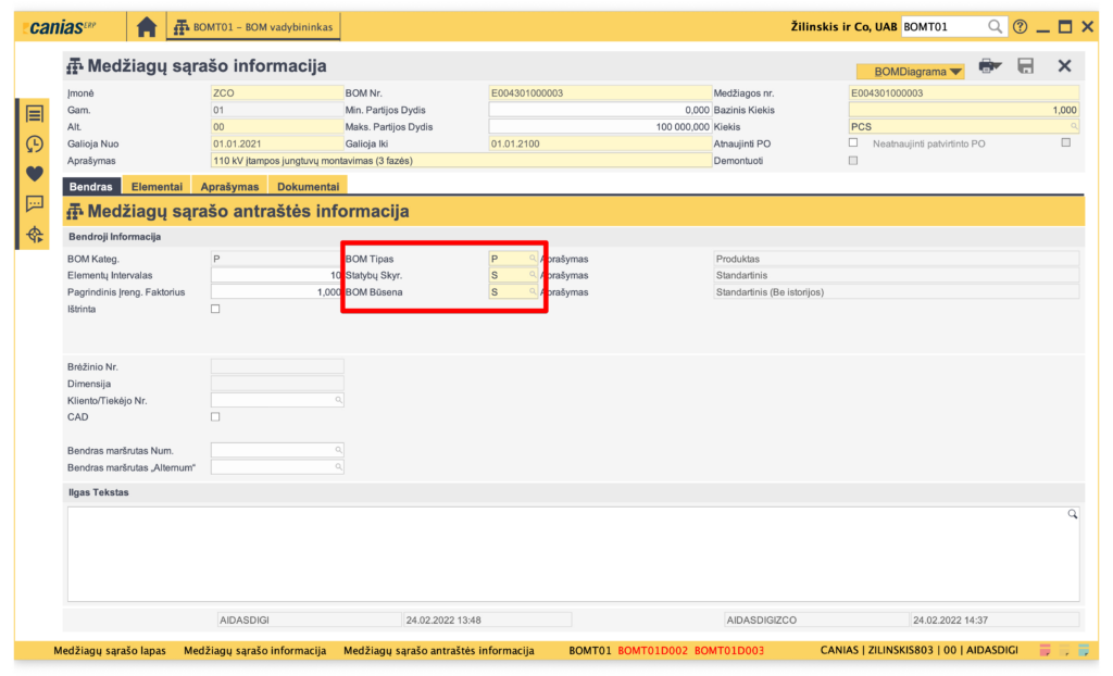- Pasirenkame 4 BOM elemento tipą. Šis tipas leidžia komponentus sudėti į žemesnio lygio sąsają pardavimuose. Kitaip tariant komponentai atvaizduojami medžio pavidalu pardavimo dokumentuose;