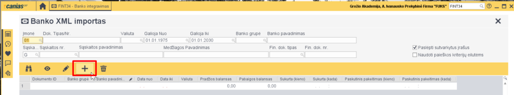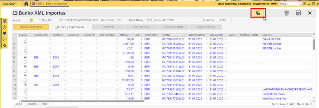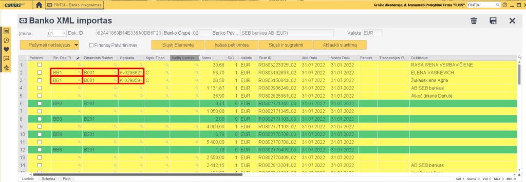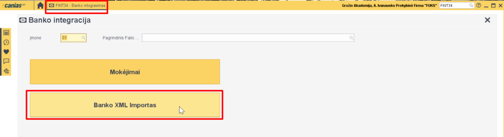 - Norint įvesti bankiniu pavedimu atliktus mokėjimus, einame į FINT34 transakciją ir spaudžiame ‘Banko XML Importas’.