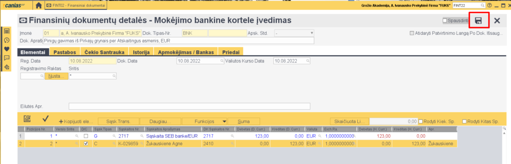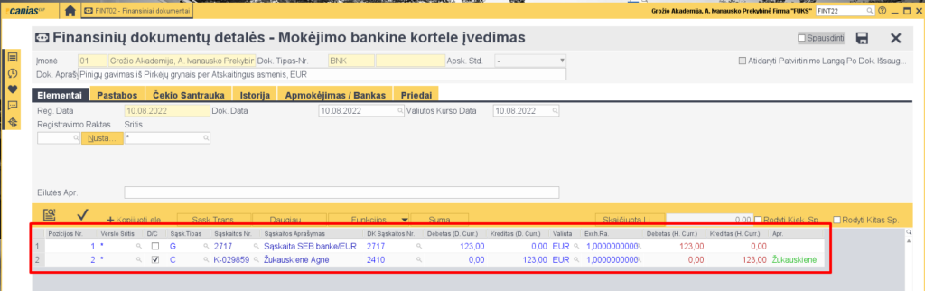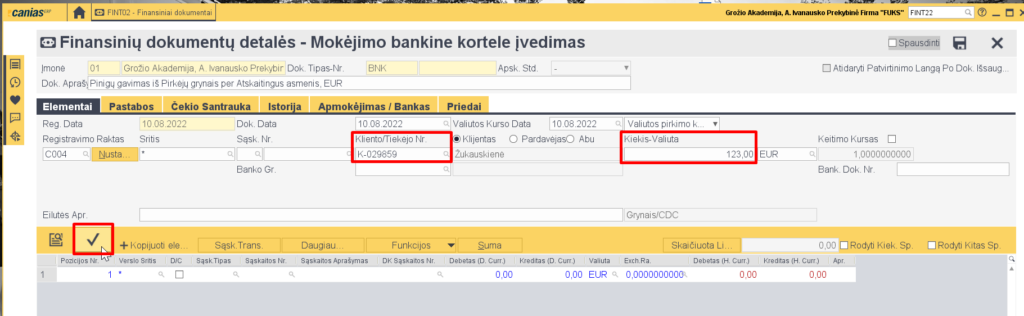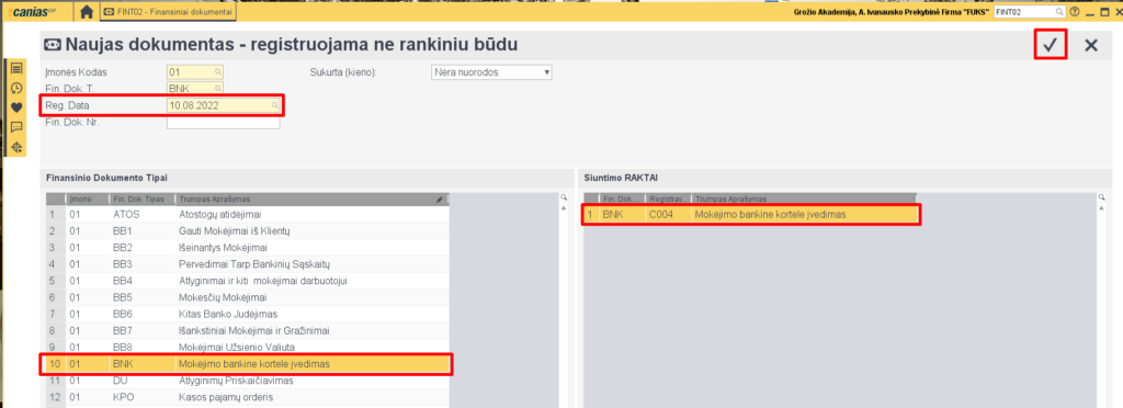 - Fin. dok. tipas – BNK (mokėjimo bankine kortele įvedimas)