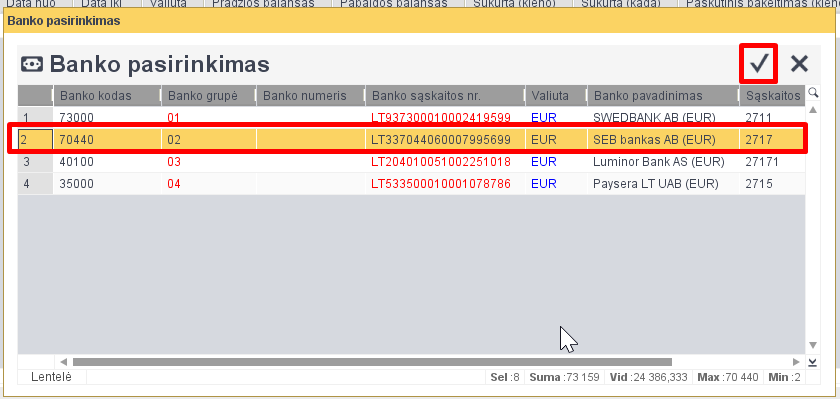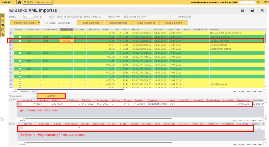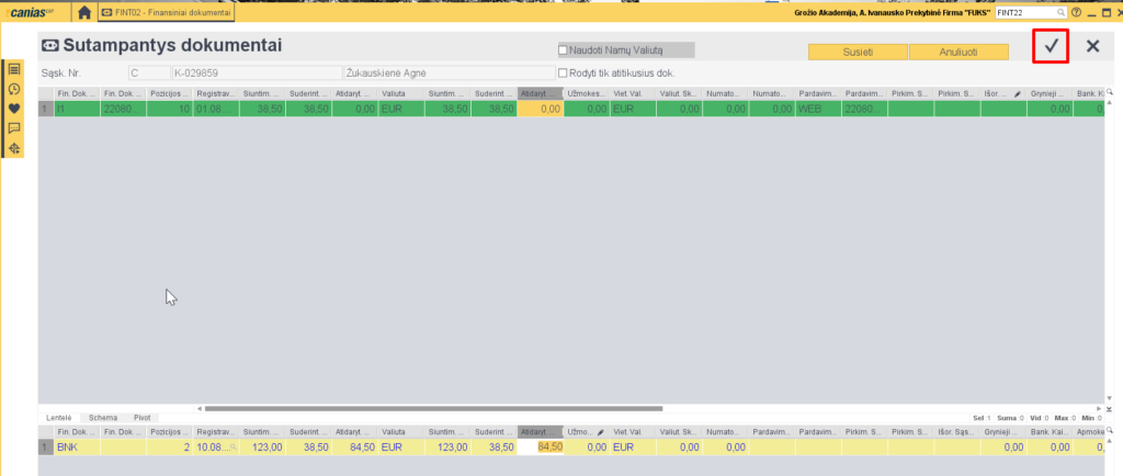 7. Sugretinę mokėjimus, paspaudžiame ‘V’. (jei mokėjimas su sąskaita sudengtas pilnai bus žalias, jei dalinai sudengta bus geltonas).