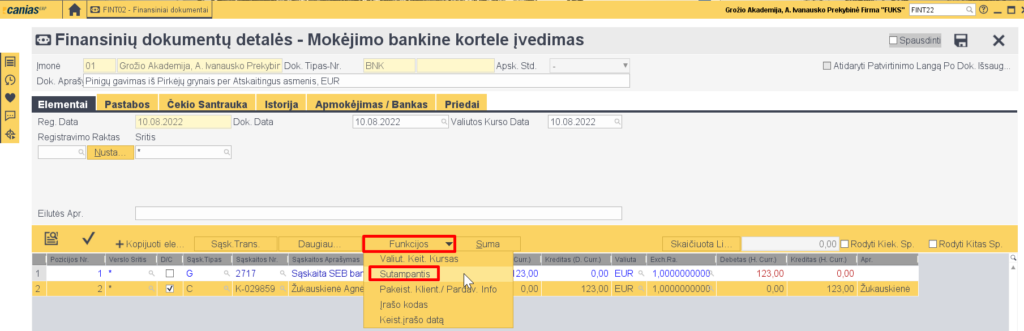 5. Norint iš karto sudengti su išrašyta ir padėta į finansus sąskaita, pasižymime kliento eilutę ir einame Funkcijos->Sutampantis: