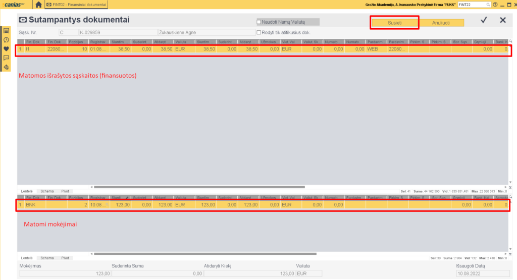 6. Atsidariusiame lange matome sąskaitas (viršutinė lango dalis) ir mokėjimo įvedimą (apatinė lango dalis). Pasižymime norimas sudengtii eilutes ir spaudžiame mygtuką ‘Susieti’.