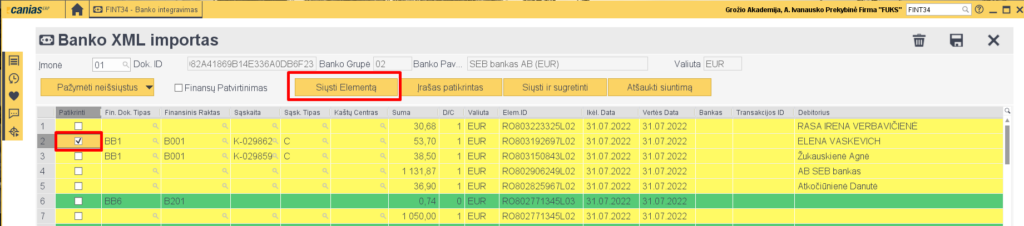 9. Kuomet viskas užpildyta, dokumentą galime užregistruoti į finansus. Pasižymime eilutę kurią registruosime ir spaudžiame ‘Siųsti Elementą’.