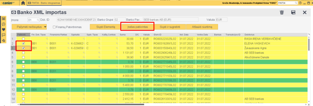 10. Jei norime registruoti kelias eilutes, tuomet pasižymime, kurias norime registruoti ir spaudžiame ‘Įrašas Patikrintas’.