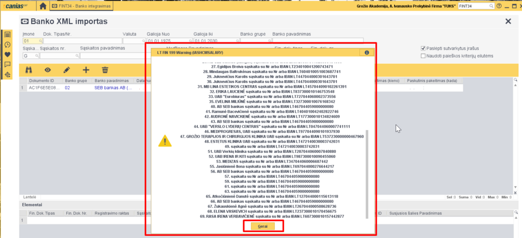 5. Toliau iššoks lentelė su nerastomis banko sąskaitomis – tai reiškia, kad prie klientų kortelių nesuvestos banko sąskaitos, tad kiekvienai eilutei reikės priskirti klientą pagal tai kas atliko mokėjimą. Jei prie kliento kortelės įsivesime banko sąskaitą, tada sistema pati automatiškai priskirs reikiamą klientą, nes matys kad jis turi būtent šią, jam priskirtą banko sąskaitą. Bet kuriuo atveju šiame žingsnyje spaudžame ‘Gerai’.