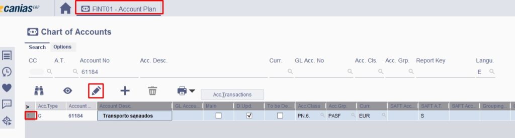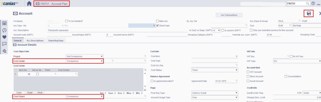 1. FINT01 išsifiltravus visas DK sąskaitas, pasirenkame sąskaitą kuriai reikia priskirti privalomą kaštų centrą/kaštų objektą -> redaguojame -> prie kaštų centro/objketo pasirenkame „Privalomas (Compulsory)“ -> išsaugoti