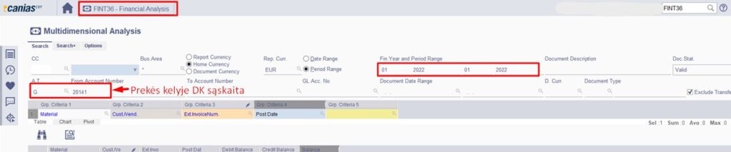 - FINT36 pasirenkame prekės kelyje DK sąskaitą, nurodome reikalingą periodą.