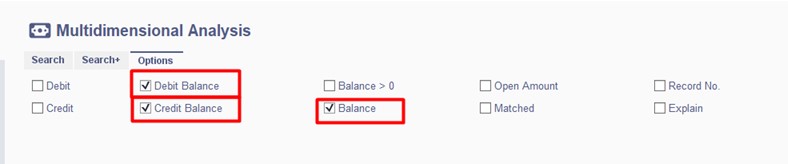 2. Search+ ir Options skiltyse pažymime reikalingus ataskaitai laukus