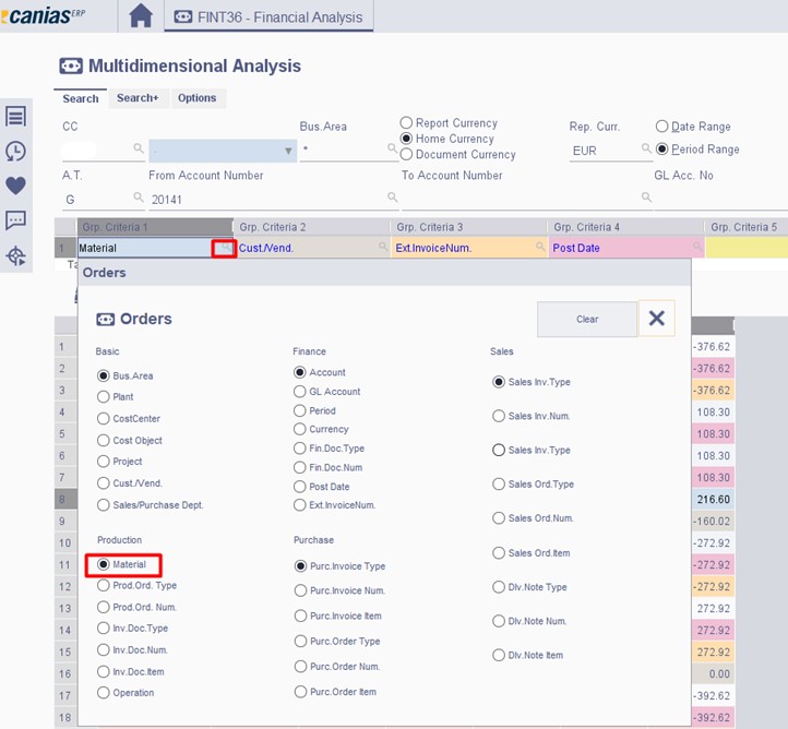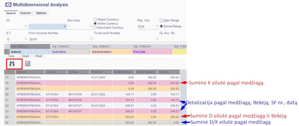 3. Grp. Criteria 1-5 laukeliuose susidedame ataskaitai reikalingus filravimo kriterijus – pvz. medžiagos kodas, Tiekėjas., Tiekėjo SF nr., Data ir t.t.