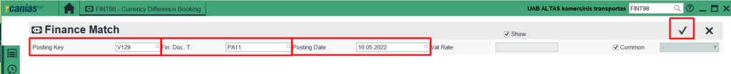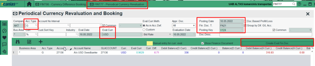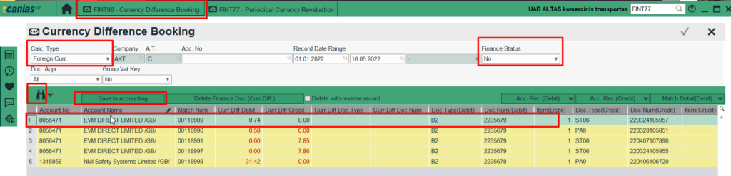 Norint padaryti valiutos perkainojimą įvestom sąskaitom, naudojame FINT98 transakciją. Pasirenkame skaičiavimo tipą (Calc. Type) – Foreign Curr. ir finansavimo statusą – NO (nefinansuotos oferacijos). Atsifiltruojame ir mums reikalingas operacijas galime saugoti į finansus (Save to Accounting).