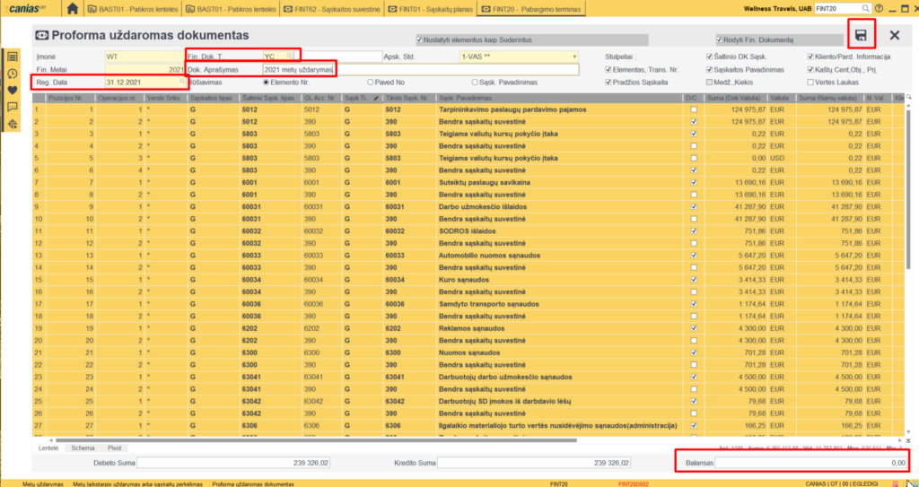 Atsidariusiame lange, mum parodo balansinių klasių sumą. Pasitikriname Registravimo datą, pasirenkame Finansinio dokumento tipą, įvedame aprašymą, pasižymime visas eilutes ir spaudžiame saugoti.