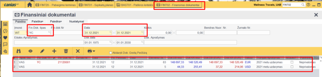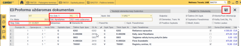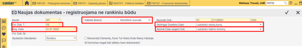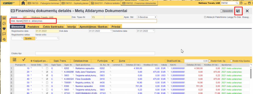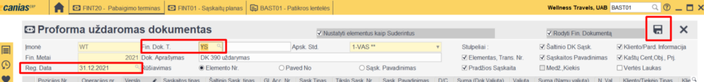 - Finansinio dokumento tipas – pasirenkame YS – metų atidarymas;
