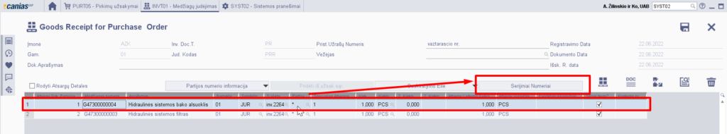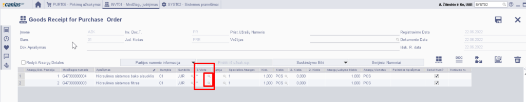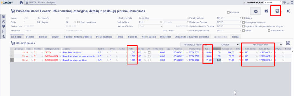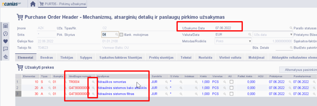 Naujai atsidariusiame lange pasikoreguojame užsakymo datą (pagal sąskaitos datą) ir isivedame mums reikiamas prekių/atsarginių daių bei paslaugų eilutes. Jei trūksta reikiamų medžiagų kortelių, jas susikuriame per BAST03 (kuiame atitinkamai ar tai atsarginės dalys – renkamės SPAR tipą; ar tai paslauga – renkams SERV tipą).