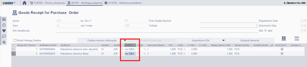 Susivedus šį pirkimo užsakymą, reikia prekes/atsargines dalis prisiimti į sandėlį. Tą padaryti galime per INVT01 transakciją. Pasirenkame nuorodą GAVIMAS, jei nėra pgal pavyzdį žeiau pasirenkame tinkamus laukus: