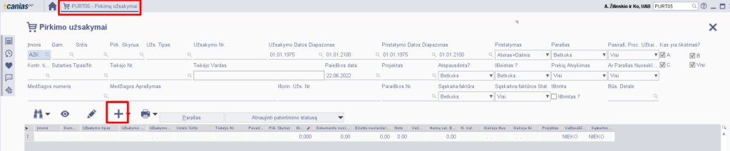 Dalių ir paslaugų pirkimas vykdomas per PURT05 transakciją. Atsidarome ir spaudžiame ‘+‘ norint kurti naują dokumentą.