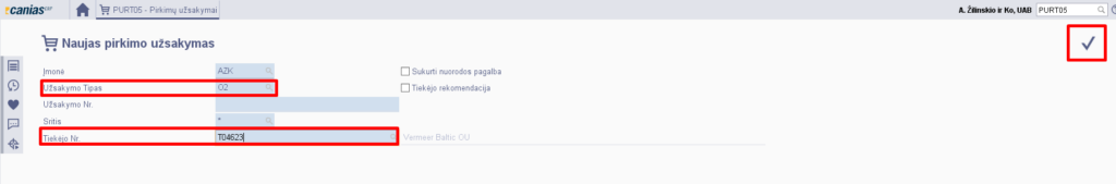 • Dokumento tipas – mūsų kurto pirkimo užsakymo dokumento tipas;