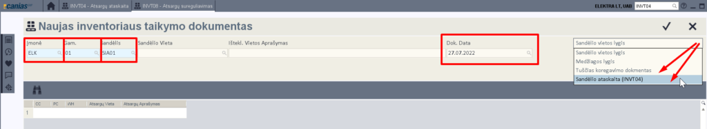 Nusistatome įmonę, gamyklą, sandėlį, dokumento datą ir atitinkamai pasirenkame kaip kursime inventorizacijos dokumentą:
