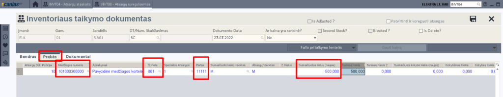Jei kuriame pagal ‘Tuščias koregavimo dokumentas‘, atsidariusiame lange einame į Prekės skirtuką ir pridedame mūsų suskaičiuotą trūkstamą prekę, jos sandėlio vietą, partiją, suskaičiuotą kiekį. Tokiu principu į dokumentą galime traukti tiek eilučių kiek norime.