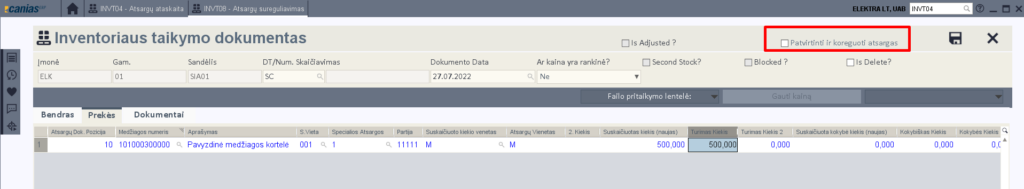 Pagaigus vesti dokumento informaciją, galime arba iš karto koreguoti pagal jį sandėlio likutį pasirenkant ‘Patvirtinti ir koreguoti atsargas’ arba galime dokumentą tiesog išsaugoti ir kiek norime jį koreguoti, kad nekurti daug naujų dokumentų ir kai bus galutinai sudėtos visos eilutės, jį tuomet saugoti pažymint ‘Patvirtinti ir koreguoti atsargas’.