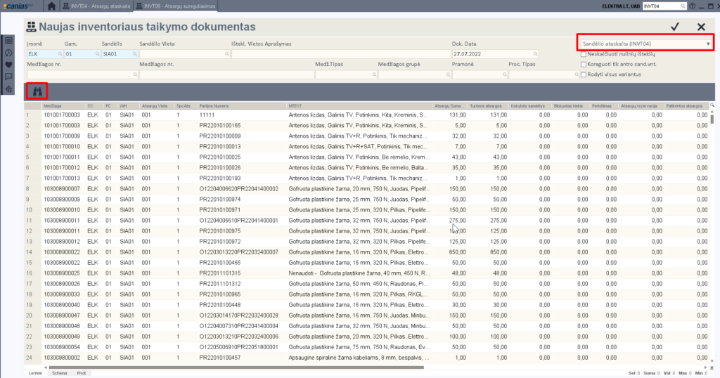 Jei kuriame pagal ‘Sandėlio ataskaita (INVT04)‘ atsifiltruojame visas sandėlio pozicijas ir pasirenkame kurias skaičiuosime, jei norime galime pasirinkti ir visas.