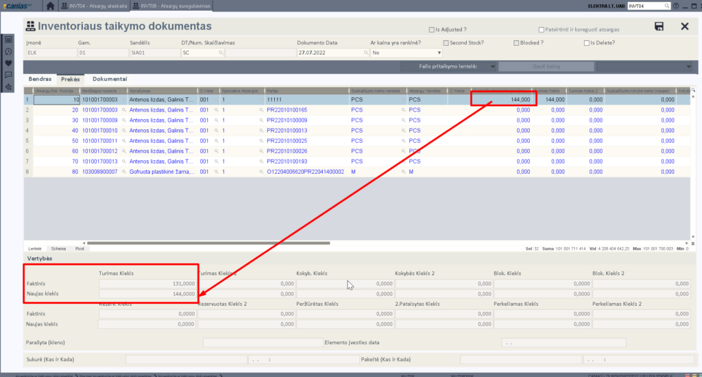 Pasirinktos pozicijos ateina į prekių skirtuką, kuriame kaip ir prieš tai galime vesti suskaičiuotą mūsų kiekį. Taip pat apačioje matome kiek iki skaičiavimo sistemoje yra šių prekių: