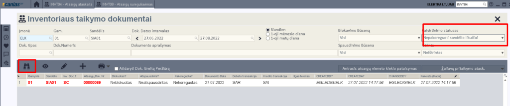 Jei iš karto nesaugojome koreguojant sandėlio likučius, dokumentą galime susirasti pasirenkant pasirinkimą ‘Nepakoreguoti sandėlio likučiai’.