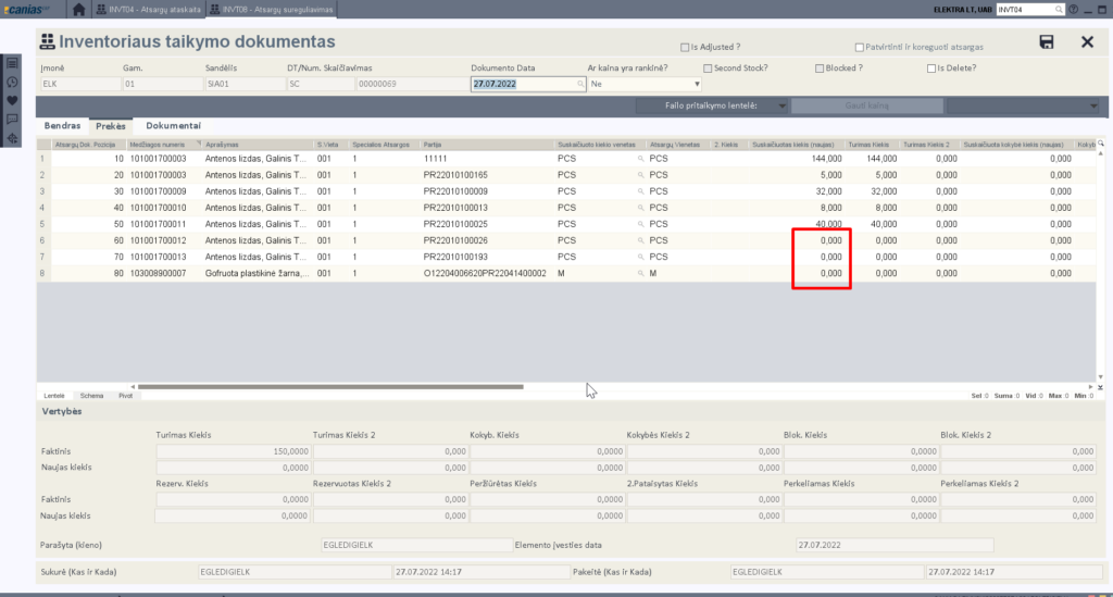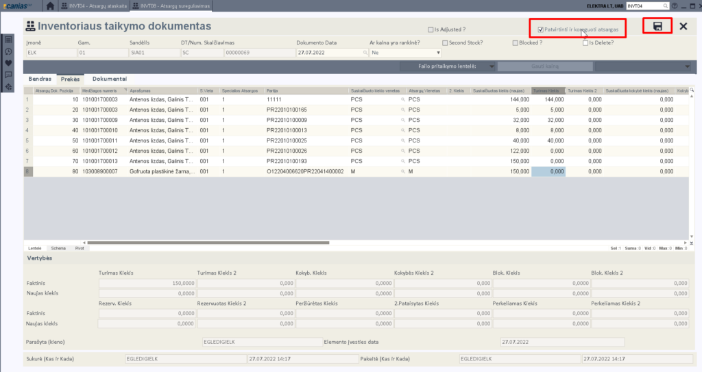 Kai viskas suskaičiuota, dokumentą saugome pasižymėję ‘Patvirtinti ir koreguoti atsargas’.