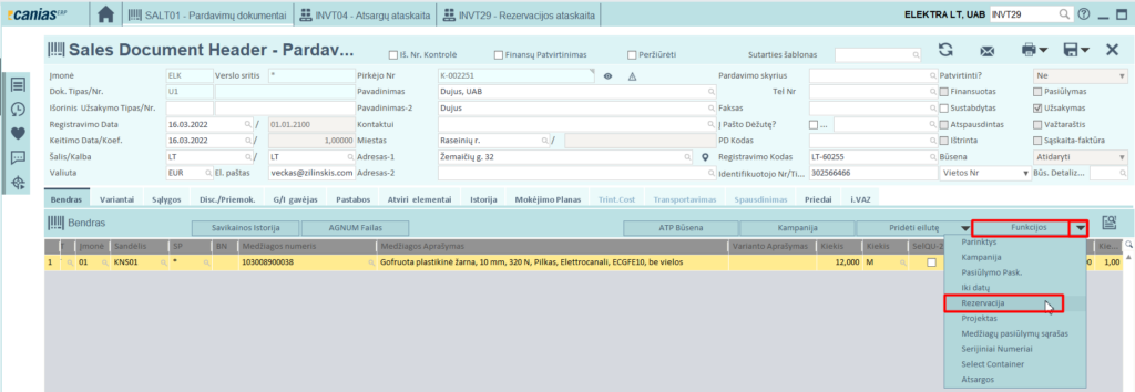 Jei norime užsakymo žingsnyje rezervuoti konkretų prekės partijos numerį, tuomet užsakymo žingsnyje pasirankame Funkcijos->Rezervacija ir galime ieškoti pagal partijos numerį, kurį norime rezevuoti.
