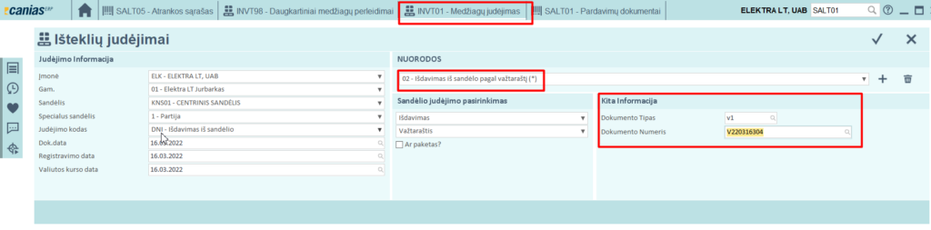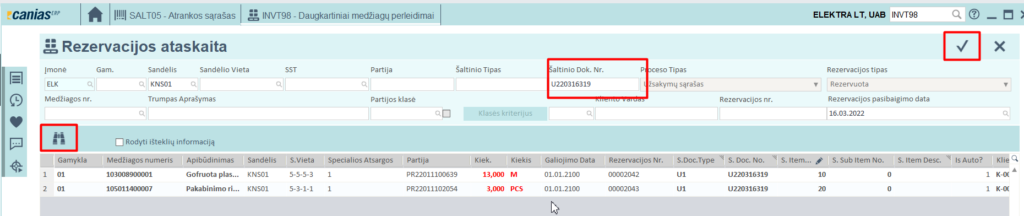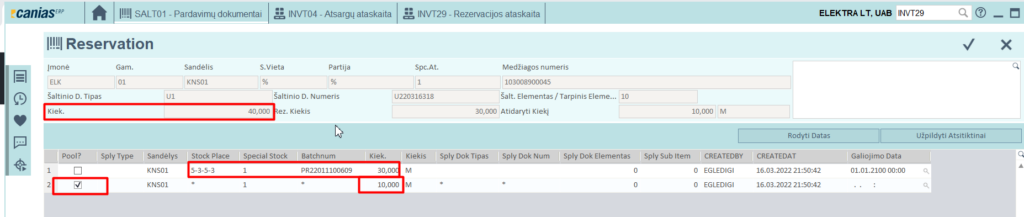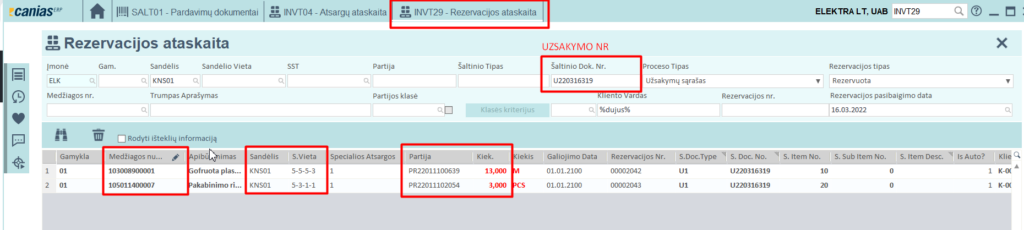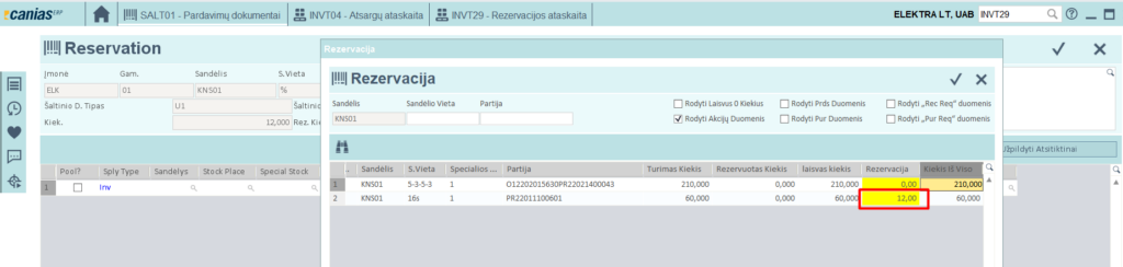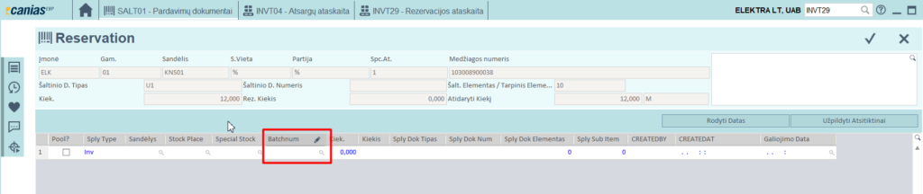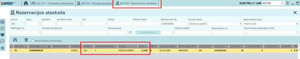 Atėjus į INVT29 ataskaitą matysime mūsų rezervaciją su mūsų pasirinktu partijos numeriu, o ne sistemos parinktą partijos numerį.