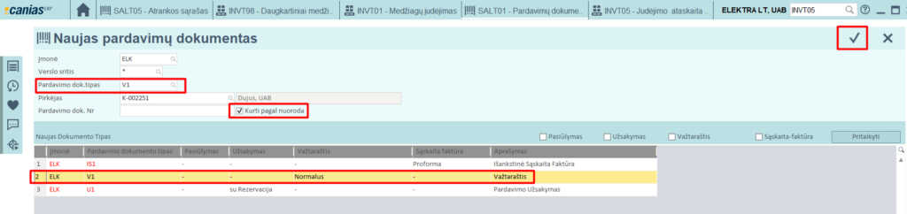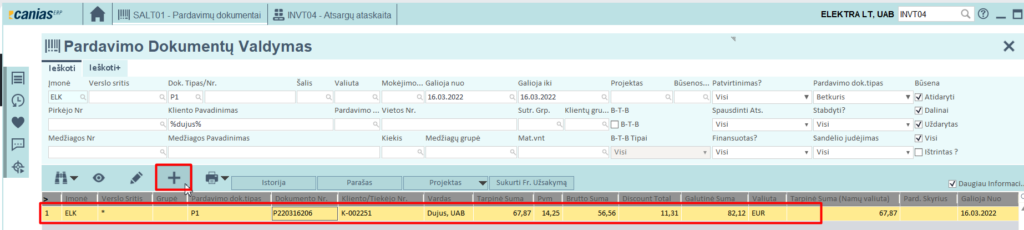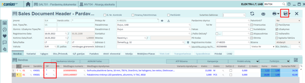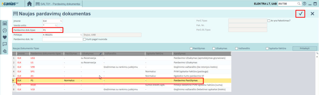 Kuriame naują dokumentą per SALT01 transakciją. Pirmiausiai kuriame pasiūlymą (P1 dokumeto tipas), kuriame parenkame klientą dominančias prekes.