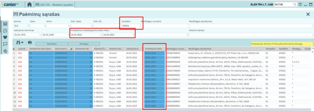 Sandėlininkui norint sužinoti kuriuos užsakymus reikia atkrauti, naudojame SALT05 transakciją, kurioje matosi pagal pristatymo datas, kokie užsakymai ir kada turi būti paruošti.