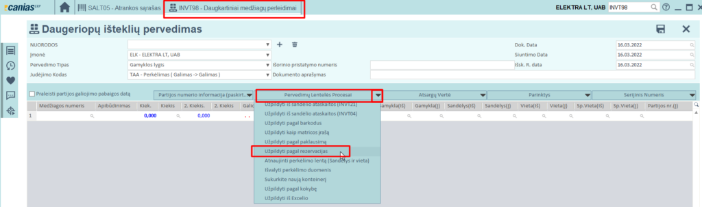 INVT98 transakcijoje pasirenkame Pervedimų lentelės procesai->Užpildyti pagal rezervacijas.