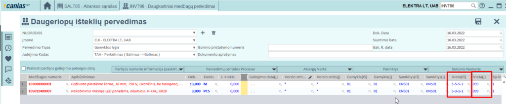 Pažymėjus rastas prekes, sistema automatiškai užpildo iš kurios vietos prekės paimtos ir mum tik reikia nurodyti mūsų atkrovimo lokaciją (099). Saugome perkėlimo dokumentą.