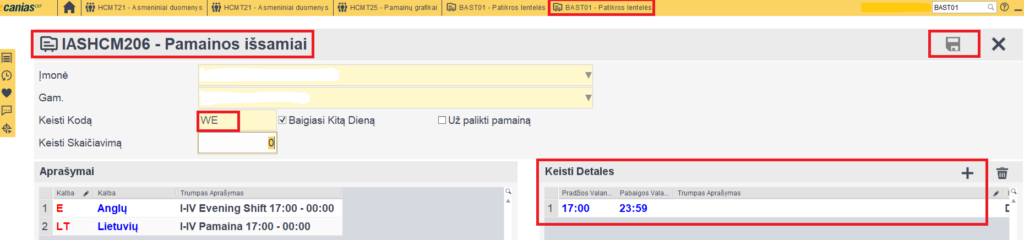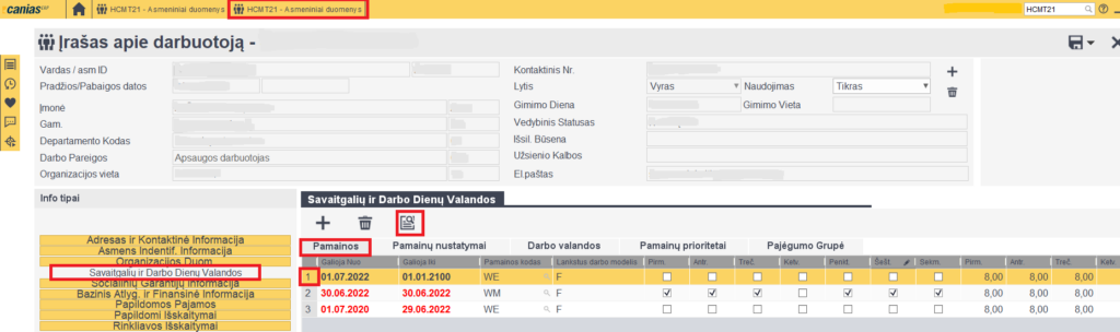 1. HCMT21 reikia susitvarkyti darbuotojo kortelę. Reikia sutvarkyti  „savaitgalių ir darbo dienų“ skiltį pamainos, pamainų nustatymai ir t.t.). Savaitgalių ir darbo dienų valandos -> Pamainos -> kuriame naują arba knygutę paspaudę redaguojame esamą eilutę.
