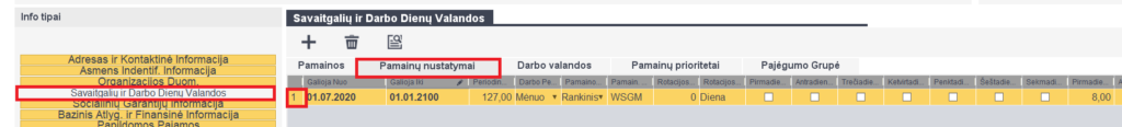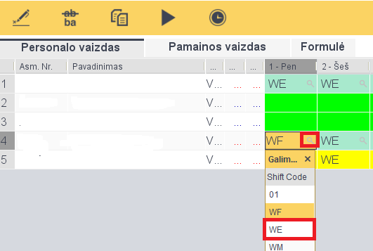 Jei norime automatizuotai priskirti darbuotojui priskirti pamainą, ir pagal ją priskirtas darbo dienos, tuomet atsidariusioje lentelėje pažymime darbuotojo eilutę -> spaudžiame laikroduko ženkliuką