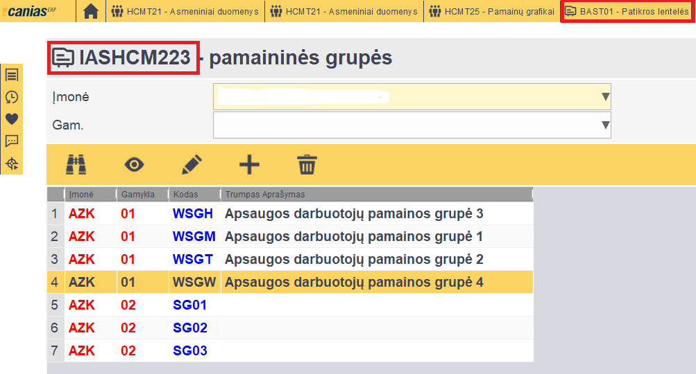 4. BAST01 -> IASHCMT223 susivedame pamainų grupes, jei reikia papildomų arba esant poreikiui koreguojama esamas