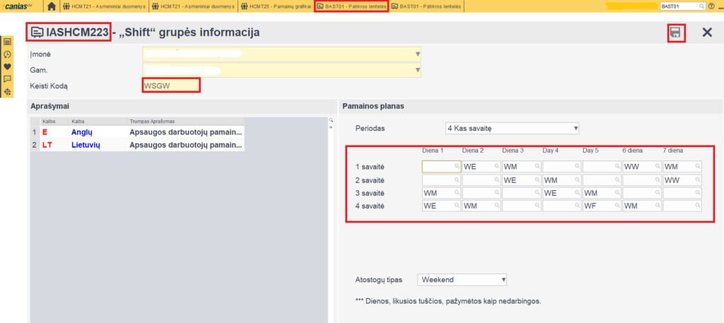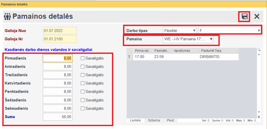 Atsidariusiame lange pasirenkame darbo tipą „flexible“, pamaina ‘WE, WF, WM ar WV“, t.y. bet kurią iš apsaugos darbuotojoms priskiriamų pamainų ir patikriname kad būtų sužymėtos visos dienos kaitėje pusėje -> išsaugome