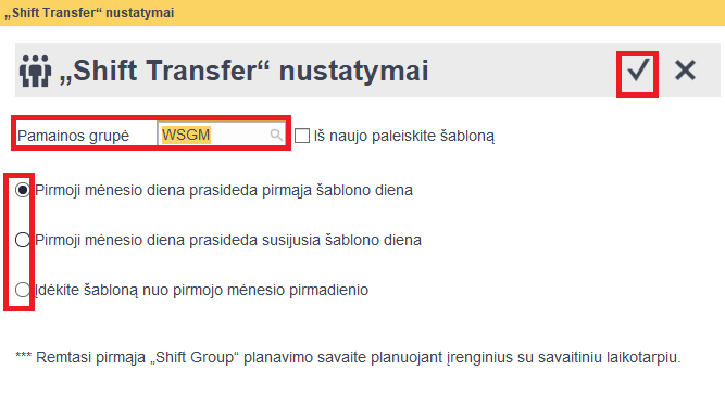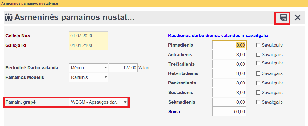 Atsidariusioje lentelėje iš sąrašo pasirenkame pamainos grupę ir nurodome nuo kada bus taikoma -> spaudžiame varnelę -> visus duomenis išsaugome