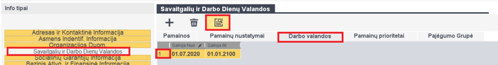 HCMT21 Savaitgalių ir darbo dienų valandos -> Darbo valandos-> kuriame naują arba knygutę paspaudę redaguojame esamą eilutę.