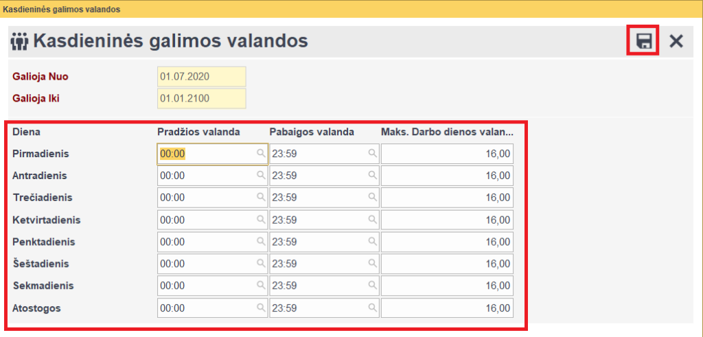 Atsidariusiame lange nurodome darbo laiko diapazoną ir maksimalias darbo valandas. Kadangi mūsų apsaugos darbuotojai gali dirbti bet kuriuo paros metu, bet maksimaliai dirbta 16val, atitinkamai nurodome lentelėje (esant kitokiems susitarimams (pvz jei maks. dirbtų 24val) reikia suvesti reikalingą informaciją)