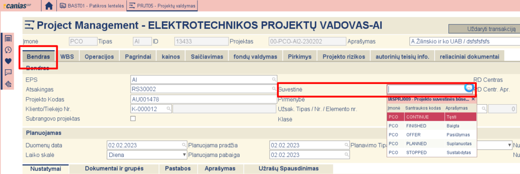 2. Įeiname į projekto vidų ir pasirenkame skirtuką ‘Bendras‘ ir įvedame Suvestinės tipą – statusą. Projektas yra tęsiamas, baigtas, suplanuotas ar sustabdytas.