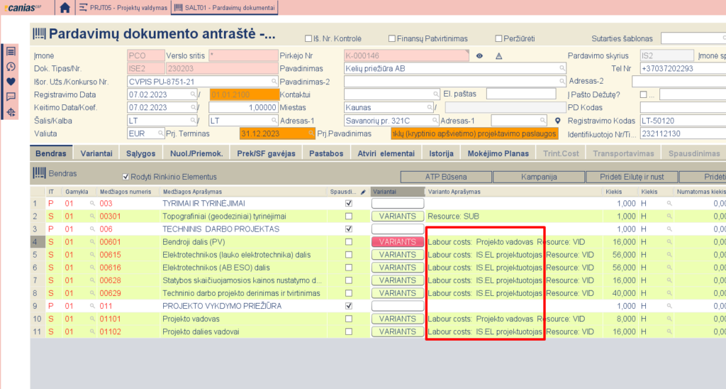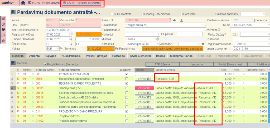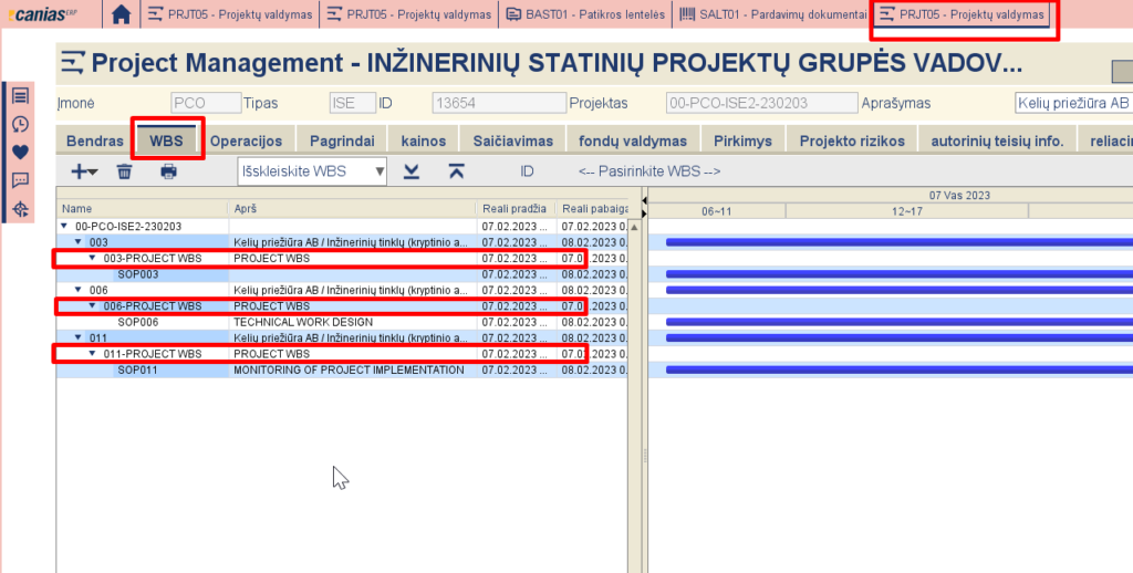 4. WBS skirtuke matosi projekto informacija pagal kiekviena operaciją, kas turi būti atlikta. Pažymėtose eilutėse matosi iš pardavimo dokumento sukritusios pagrindinės eilutės (pardavimo dokumente jos yra baltos spalvos), pagal kurias susikura paskui operacijos.