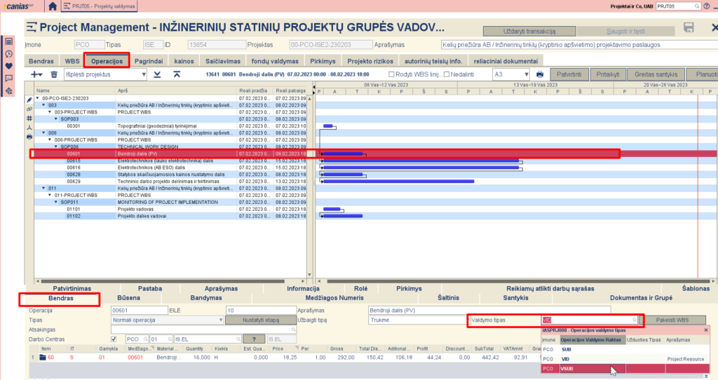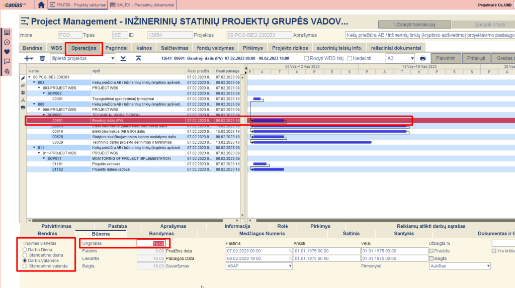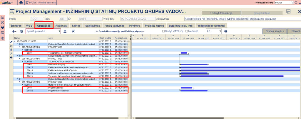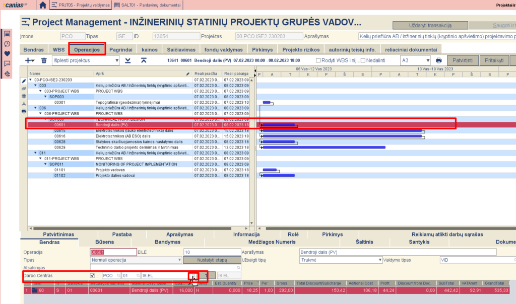 5. Operacijos skirtuke matosi kiekvieno WBS’o operacijos, kas turi būti atlikta (pardavimo dokumente šios eilutės žalios).