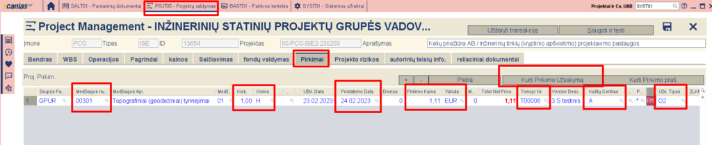 9. ‘Pirkimai‘ skiltyje galime iš karto iš projekto kurti pirkimo užsakymą spausdami mygtuką Kurti Pirkimo užsakymą. Prieš tai, žinoma, reikia įsivesti medžiagos informaciją: