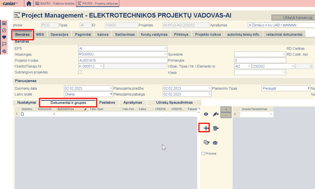 - Dokumentai ir Grupės – prisegame su projektu susijusius reikalingus dokumentus;
